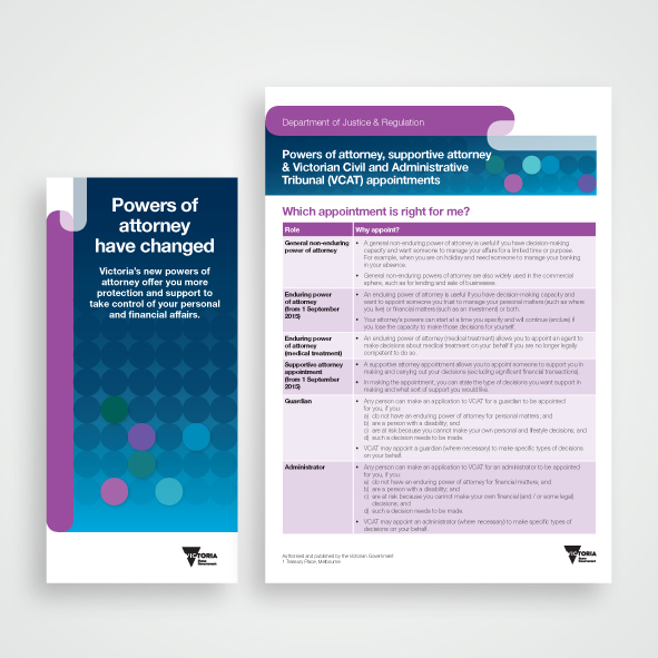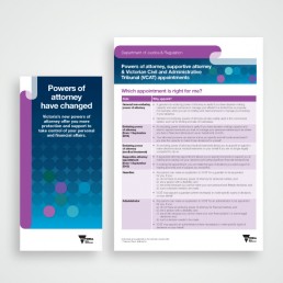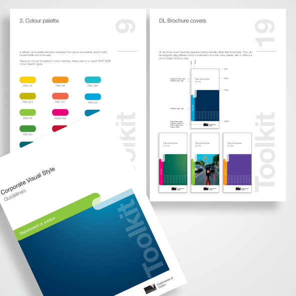 In 2012, we undertook a refresh of the Department of Justice brand. The extensive project included designing a new brand, applying it to publications and signage, documenting it in a detailed style guide and creating templates. The style had many applications over a four-year period including the Power of Attorney communication material and the departmental newsletter.